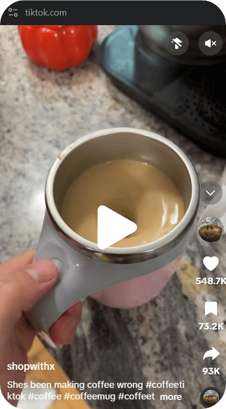 The video starts with a relatable scenario: someone struggling with a clumpy or poorly mixed coffee. Suddenly, the Self-Stirring Coffee Mug is introduced as the ultimate game-changer. Quick shots showcase the mug in action, blending coffee effortlessly with the push of a button. A voice-over or text overlay highlights its features, such as its magnetic stirring mechanism, spill-proof design, and heat-retention capabilities. The video closes with a demonstration of the perfectly blended coffee, inviting viewers to upgrade their coffee experience.Caption: "Mix it up effortlessly! ☕ #CoffeeTikTok #SelfStirringMug #CoffeeTime #GameChanger @shopwithx"